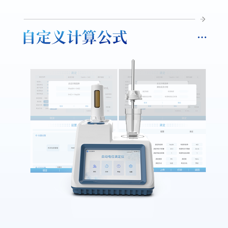 简要描述: 酸碱滴定仪可自定义计算公式,根据反应的化学方程式提前设置好计算公式,滴定完成后将自动获得待测物含量;滴定方法可自行编写并保存,形成滴定方法快捷模式,在使用时可直接选择运行,滴定方法至少可保存100种;设备可作为实验室常规手动滴定的滴定装置使用;计量泵替代滴定管,磁力搅拌功能替代手动摇晃锥形瓶的工作。